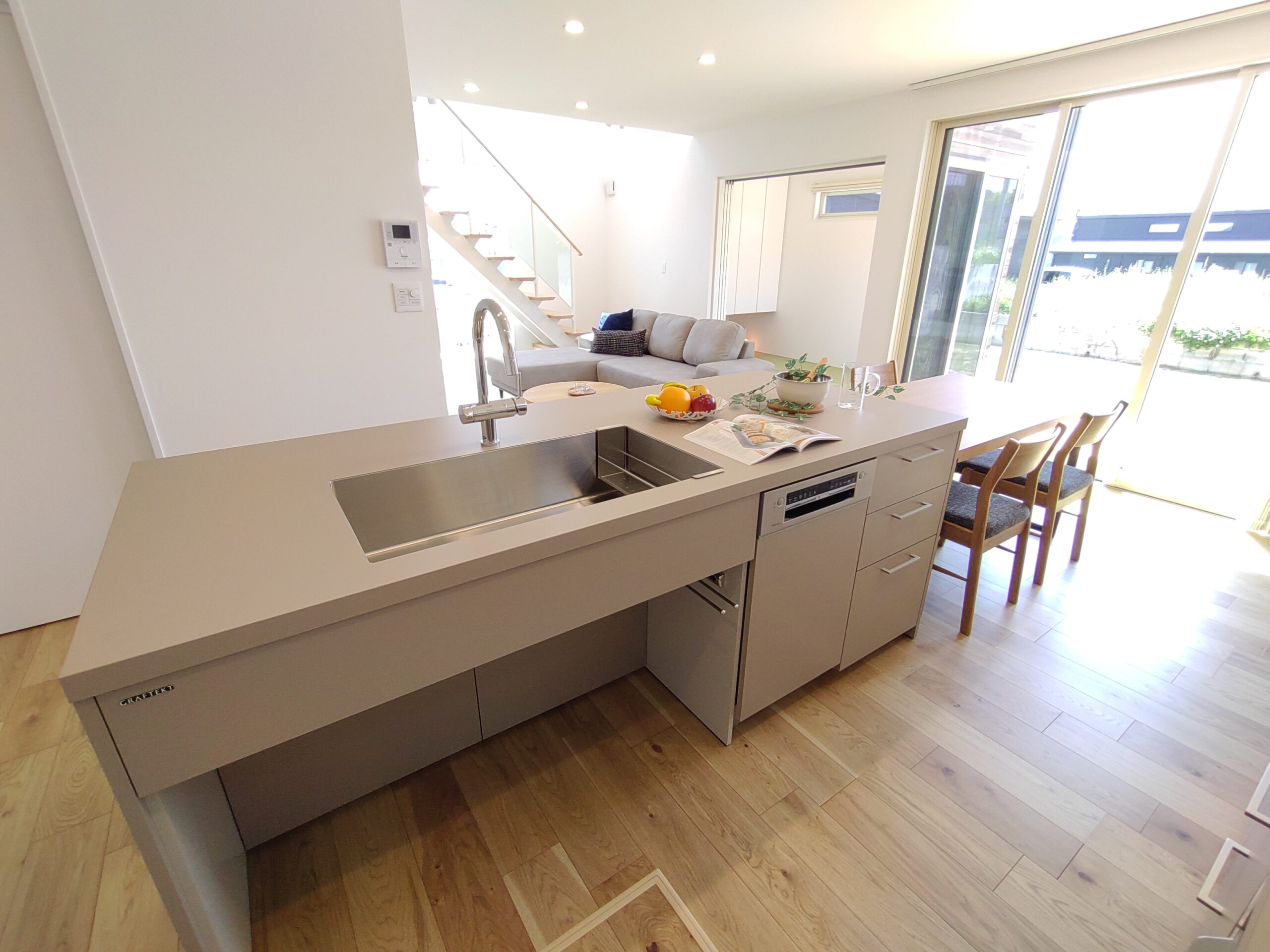 キッチンは、グラフテクトのデュエアイランドタイプなので、家族の動線もスムーズです。