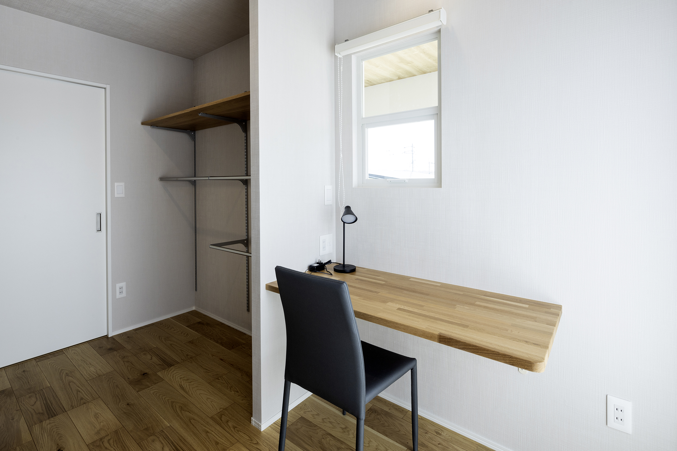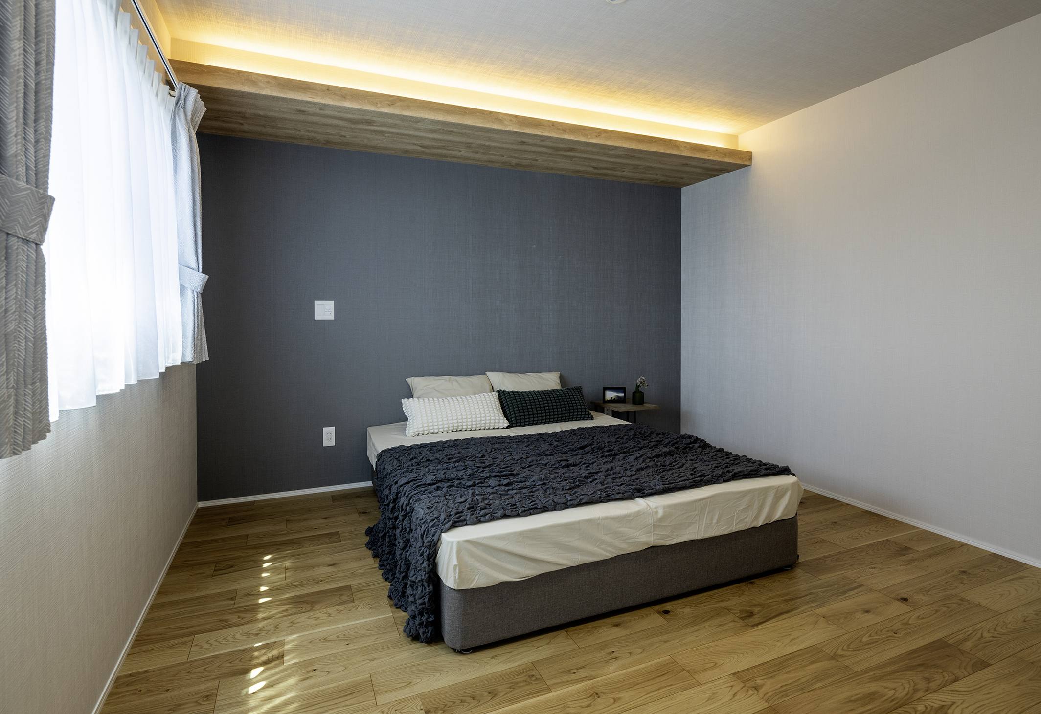 主寝室は8帖ありますので、ベッド以外の家具も置けます。枕元には、間接照明・アクセントクロスでおしゃれな空間としています。WICは、広めに設計し、バルコニー・廊下にもつながっているので、家事もスムーズです。カウンタースペースは、家事にもテレワークにも活躍します