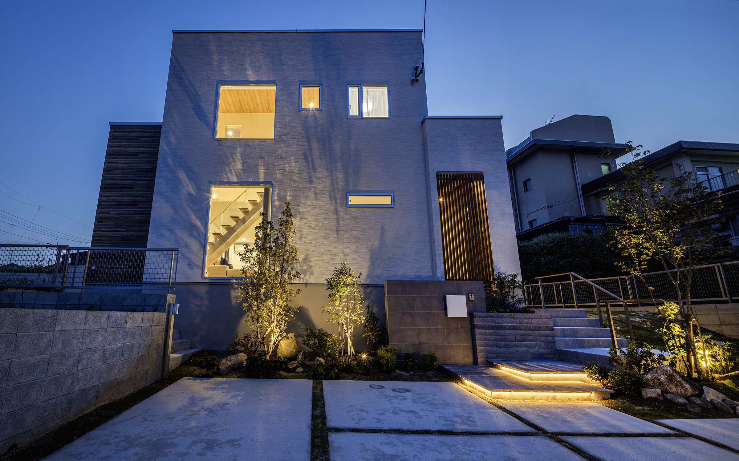 夜の外観も考慮し、外構計画では、白い壁が樹木の影で華やかになるようライトアップし、階段の段差を使った間接照明で高級感を演出しました。