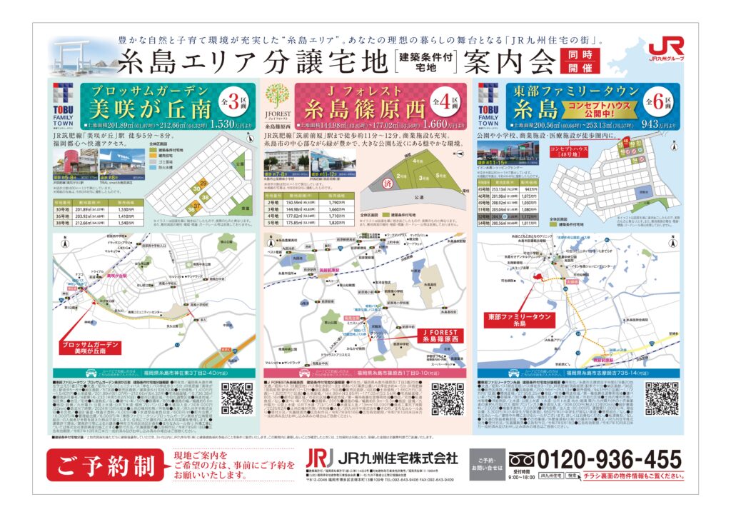 ブロッサムガーデン美咲が丘南は現地に係員がおりますので直接ご来場下さい。糸島篠原西・東部ファミリータウン糸島はご予約制となっておりますので、